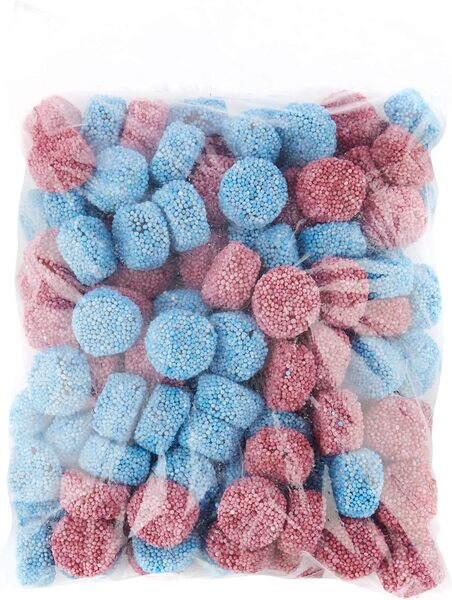 Barratt spogs or jelly buttons (the pink and blue ones from liquorice allsorts!). Pink & Blue Jelly Sprogs Party Candy Bag Barratts Jelly Spogs are a aniseed tasting soft liquorice coating jelly spog, covered in pink and blue small round beads. These have a great bursting liquorice taste. Perfect for wedding/party bags.