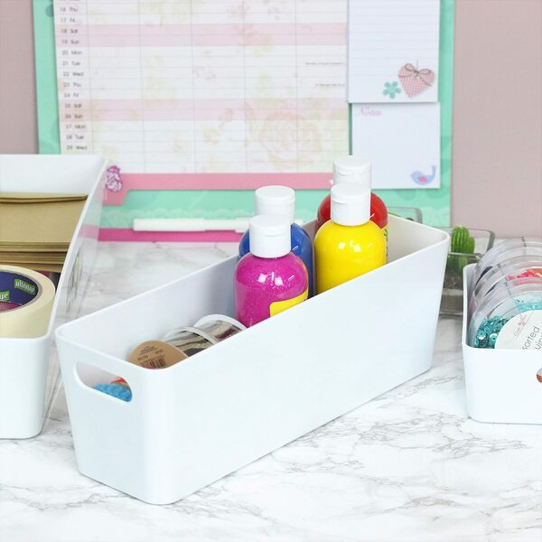 White Wham Plastic Slim Rectangle Studio Handy Storage Basket Box L 30cm x W 10cm x H 10cm Approx 2L Approx Sleek and versatile, suited to displaying your craft accessories, bathroom toiletries, makeup, pantry goods, cleaning and laundry products, stationery or toys. The handle aids easy access to slide the baskets when stored on shelves.